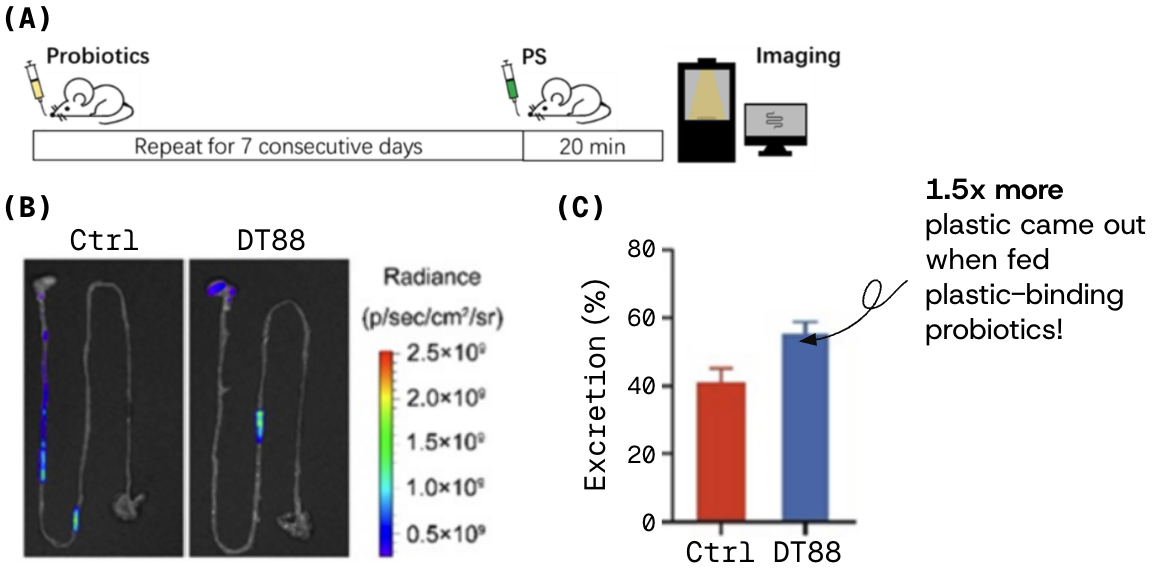 They next asked whether this would work inside of a living system. To test that, researchers gave mice DT88 for a week, and exposed them to a controlled dose of glowing microplastics. The results were straightforward: without probiotics, only about 40% plastic particles naturally passed through the mice and were excreted. When DT88 was added to the diet, almost 1.5-times more plastics were expelled from the gut. That’s a lot less plastic left inside their bodies.