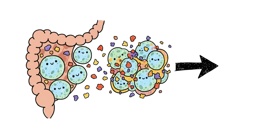 A useful way to picture this is to think of the probiotics as sticky spheres moving through the gut. As they travel, they latch onto plastic particles and pull them into clusters. Those plastics, now stuck to the spheres, are more likely to stay in the digestive tract, rather than interacting with the gut wall or crossing the gut barrier. Then, the rest is naturally taken care of by the body. The clusters are eliminated through normal digestion and excretion.